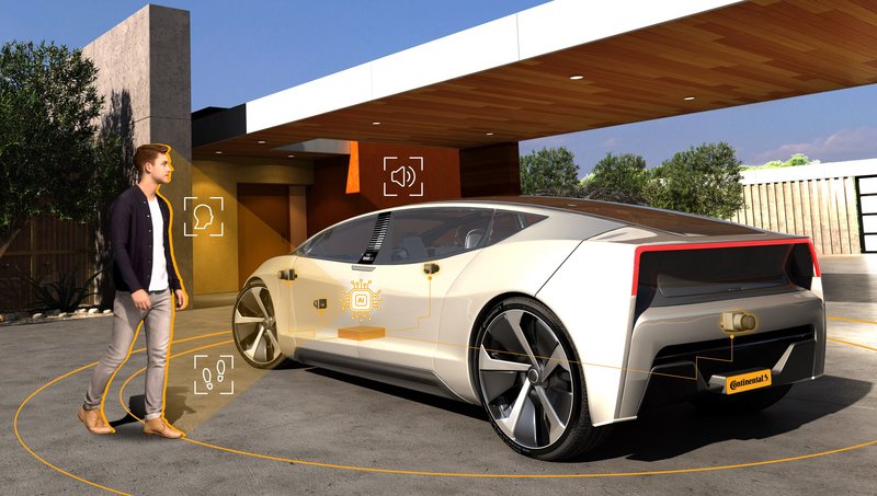 A wide range of functions are possible within the context of the vehicle-user relationship on the basis of biometrics. Among other things, Continental's demo car demonstrates approach detection (the car detects approaching persons), user identification (the car identifies authorized persons by means of facial recognition), intention recognition (the car recognizes the intention of an approaching person, for example by interpreting a hand movement in the vicinity of the door), and intuitive trunk access (the trunk opens automatically when an authorized person looks in the direction of the tailgate for a certain period of time). In the first generation of this innovation, the opening impulse is still triggered by a slight kick in the direction of the rear bumper.