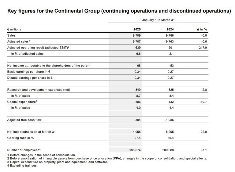 In the first quarter of 2025, Continental achieved consolidated sales of €9.7 billion (Q1 2024: €9.8 billion, -0.8 percent). Its adjusted operating result increased to €639 million, corresponding to an adjusted EBIT margin of 6.6 percent. Without the application of IFRS 5, the adjusted operating result would have been €586 million (Q1 2024: €201 million) and the adjusted EBIT margin would have been 6.0 percent (Q1 2024: 2.1 percent). Due to the planned spin-off of the Automotive group sector, the accounting standard IFRS 5 (Non-current Assets Held for Sale and Discontinued Operations) has been applied as required. Consequently, since the Supervisory Board approved the spin-off on March 12, 2025, depreciation on those parts of the business earmarked for spin-off has no longer been taken into account.