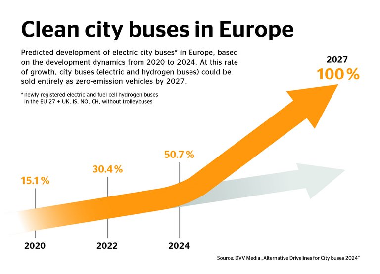 The tire manufacturer is consistently aligning its development for the bus segment with the megatrends of urbanization and emission-free mobility. According to the EU authority Eurostat, around 80 percent of Europeans will live in urban centers by 2030. This makes low-noise and low-emission transport solutions and digital traffic management systems indispensable. The ambitious EU climate targets and new regulations are reinforcing this development. According to the European Commission, only zero-emission buses will be newly registered from 2030. In 2024, 50 percent of all newly registered city buses in the EU were already clean (source: DVV Media „Alternative Drivelines for City buses 2024“). In countries such as the Netherlands, Denmark, Slovenia, Ireland, Finland, and Portugal, this figure was 100 percent.
