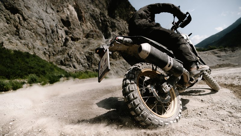 In particular, the tread blocks on the front tire, which are steeply sloped downwards in the direction of travel, improve grip when braking off-road, while the block design on the rear tire, which is designed in the exactly opposite direction, provides optimum traction during acceleration.