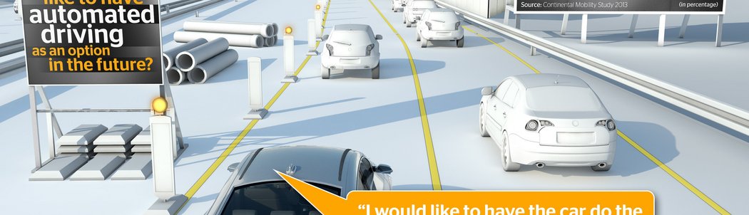 Hanover, January 14, 2014. Motorists worldwide are principally open to automated driving. A clear majority of participants in the "Continental Mobility Study 2013" welcome technology of this kind: 79% in China, 61% in Japan, 53% in Germany, and 41% in the U.S. realize the benefit of automated driving. When asked about their individual intentions for using the technology, drivers specified they would chiefly like to be driven through freeway roadwork and traffic jams as well as along long freeway stretches. They would also like to have their cars park themselves in parking garages.