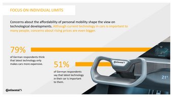 People are increasingly worried about the affordability of their mobility. Generally high inflation rates and above all the rapid rise in energy prices are threatening to put the brakes on the transformation of mobility in Germany. Sustainability, specifically in relation to cars, is becoming increasingly relevant to a majority of German citizens. In accordance with this, only 44 percent of Germans surveyed expect the future of mobility to be electric. For a narrow majority of people in Germany, however, environmentally friendly mobility is not currently viewed as a priority against the backdrop of high electricity, gasoline and diesel fuel prices. In addition, more than half of those surveyed in Germany will no longer be able to afford to drive if the price of gasoline exceeds €2.80 per liter...