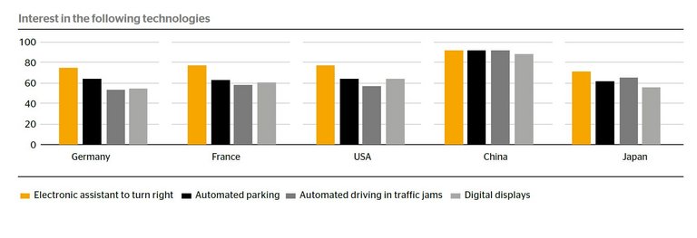 What’s more, in all countries, the number of technology enthusiasts who welcome new safety and comfort assistance systems exceeds the number of skeptics. The latter are most prevalent in Germany, while in Japan and China the number of doubters is small.
