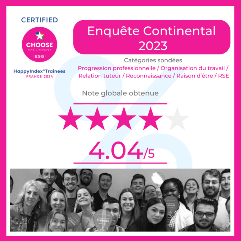 Le sondage Happy Trainees est un sondage réalisé auprès de nos stagiaires et alternants sur la qualité de leur apprentissage au sein de Continental. Nous obtenons par la suite une note de classement basée sur un questionnaire sur 6 catégories : la progression professionnelle, l’organisation du travail, la relation tuteur, la reconnaissance, la raison d'être, la RSE. Ces notes nous permettent de recevoir le Label Happy Trainees grâce à la qualité des expériences et missions proposées à nos alternants et stagiaires ! Cette année nous avons obtennu la note de 4.04/5, un chiffre qui nous rend fiers et qui reflète la qualité de notre accompagnement auprès de nos étudiants !