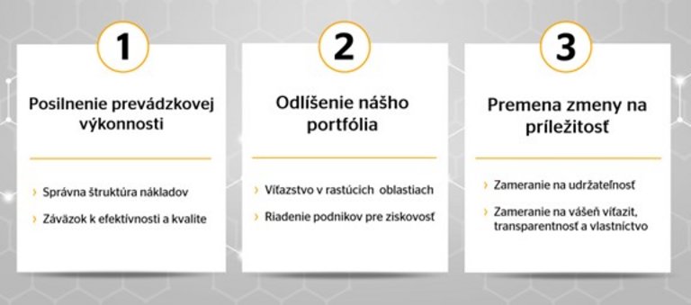 Vytváranie hodnoty.Všetko, čo robíme, je navrhnuté na vytváranie hodnoty. Táto hodnota môže byť finančná pre našich akcionárov, ale aj hodnota pre našich zákazníkov, zamestnancov a spoločnosti, v ktorých pôsobíme. | Lepší zajtrajšok.Naším cieľom je: budovať lepší zajtrajšok. Našimi produktmi a službami prispievame k tomu, aby bol svet o niečo lepší. Vyvíjame a vyrábame mobilitné a priemyselné riešenia zajtrajška, čím ich robíme bezpečnejšími, pohodlnejšími a udržateľnejšími. Zároveň lepší zajtrajšok znamená konať teraz a nie v ďalekej budúcnosti. Každodenne. |