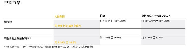 - 大陆集团中期发展预期:预计销售额约为195亿至220亿欧元,调整后的息税前利润率约为12%至14.5%